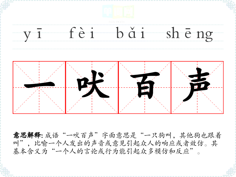 成语“一吠百声”字面意思是“一只狗叫,其他狗也跟着叫”,比喻一个人发出的声音或意见引起众人的响应或者效仿。其基本含义为“一个人的言论或行为能引起众多模仿和反应”。