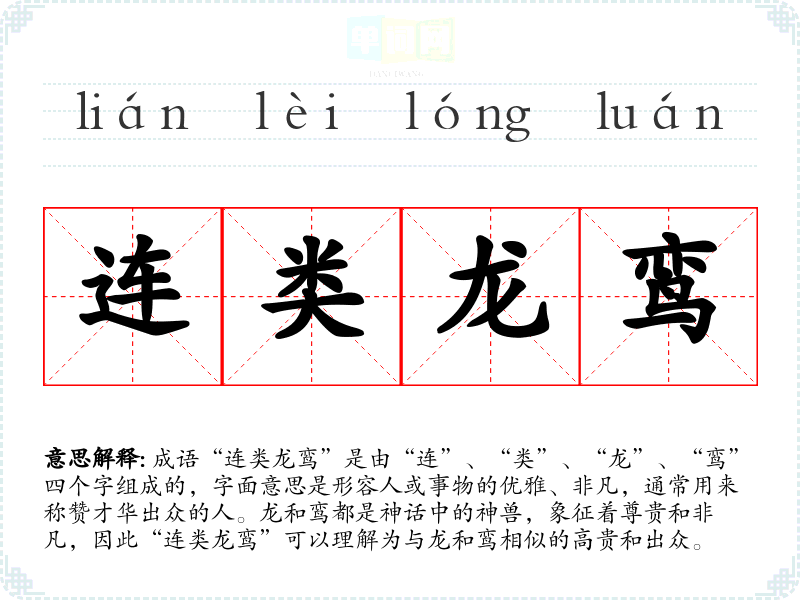 成语“连类龙鸾”是由“连”、“类”、“龙”、“鸾”四个字组成的,字面意思是形容人或事物的优雅、非凡,通常用来称赞才华出众的人。龙和鸾都是神话中的神兽,象征着尊贵和非凡,因此“连类龙鸾”可以理解为与龙和鸾相似的高贵和出众。