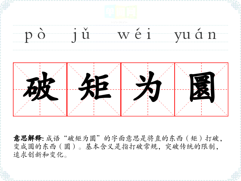 成语“破矩为圜”的字面意思是将直的东西(矩)打破,变成圆的东西(圜)。基本含义是指打破常规,突破传统的限制,追求创新和变化。
