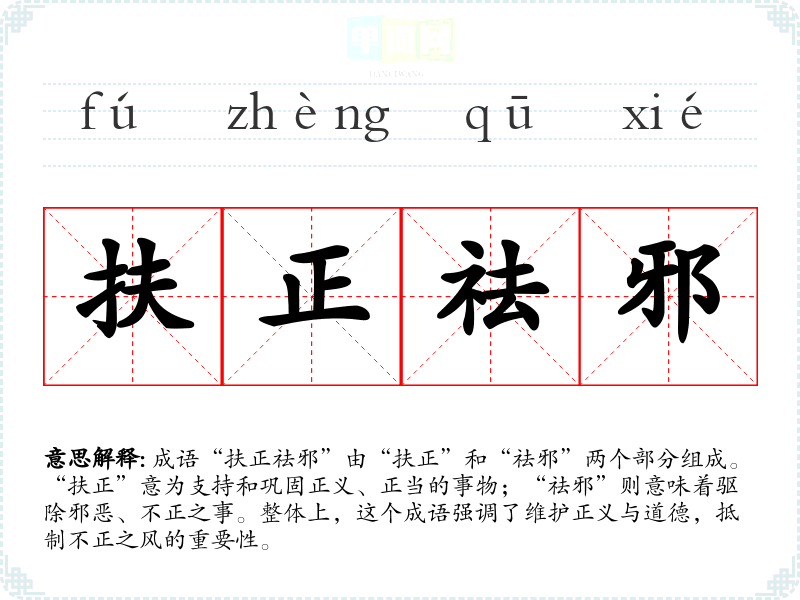 成语“扶正祛邪”由“扶正”和“祛邪”两个部分组成。“扶正”意为支持和巩固正义、正当的事物;“祛邪”则意味着驱除邪恶、不正之事。整体上,这个成语强调了维护正义与道德,抵制不正之风的重要性。