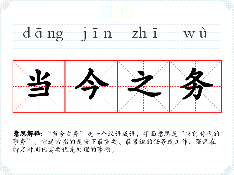 - 日常对话:朋友间讨论工作或学*时,可能会提到“当今之务”来表示当前需要重点关注的事情。