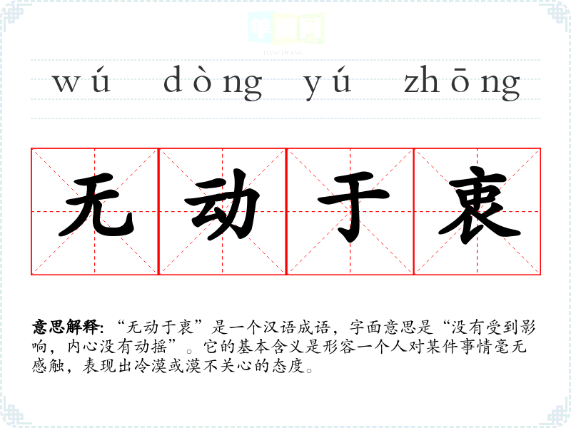 “无动于衷”是一个汉语成语,字面意思是“没有受到影响,内心没有动摇”。它的基本含义是形容一个人对某件事情毫无感触,表现出冷漠或漠不关心的态度。