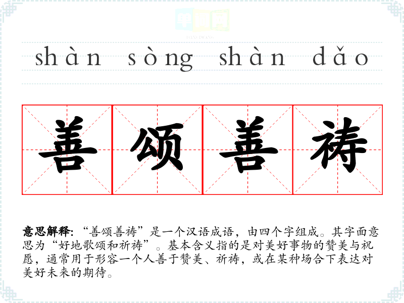 通过对“善颂善祷”的学,我更加理解了这个成语所蕴含的积极意义。在语言学和表达中,能恰当地使用这样的成语不仅丰富了我的表达,也能让人际关系更加和谐。它提醒我在生活中多关注美好,传递正能量。