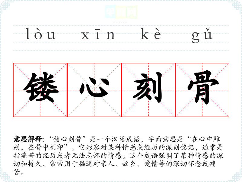 “镂心刻骨”是一个汉语成语,字面意思是“在心中雕刻,在骨中刻印”。它形容对某种情感或经历的深刻铭记,通常是指痛苦的经历或者无法忘怀的情感。这个成语强调了某种情感的深切和持久,常常用于描述对亲人、故乡、爱情等的深切怀念或痛苦。