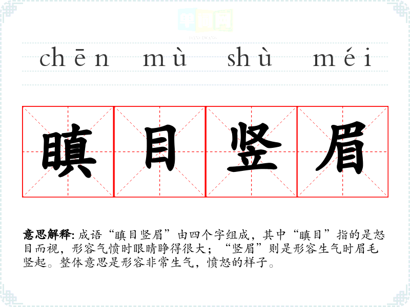 成语“瞋目竖眉”由四个字组成,其中“瞋目”指的是怒目而视,形容气愤时眼睛睁得很大;“竖眉”则是形容生气时眉毛竖起。整体意思是形容非常生气,愤怒的样子。