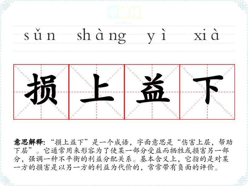 “损上益下”是一个成语,字面意思是“伤害上层,帮助下层”。它通常用来形容为了使某一部分受益而牺牲或损害另一部分,强调一种不平衡的利益分配关系。基本含义上,它指的是对某一方的损害是以另一方的利益为代价的,常常带有负面的评价。