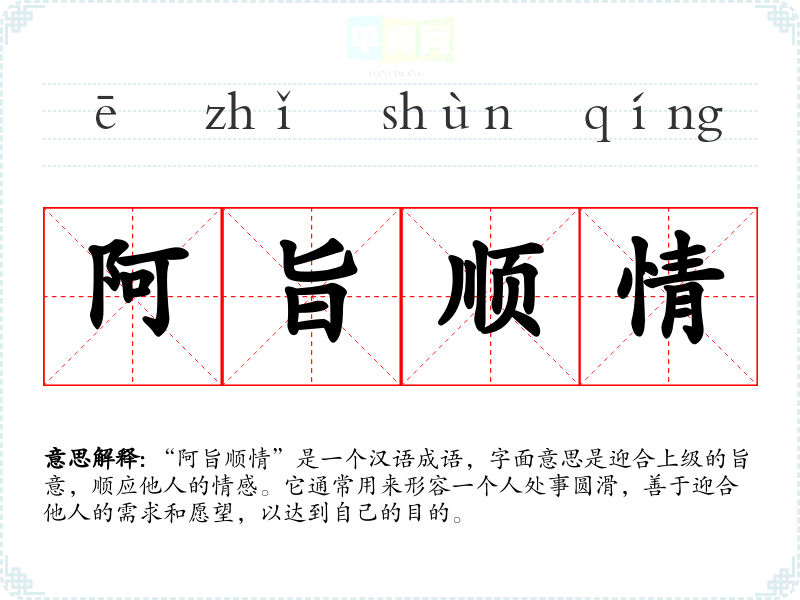“阿旨顺情”是一个汉语成语,字面意思是迎合上级的旨意,顺应他人的情感。它通常用来形容一个人处事圆滑,善于迎合他人的需求和愿望,以达到自己的目的。