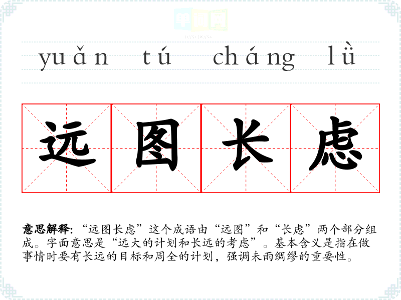 “远图长虑”这个成语由“远图”和“长虑”两个部分组成。字面意思是“远大的计划和长远的考虑”。基本含义是指在做事情时要有长远的目标和周全的计划,强调未雨绸缪的重要性。