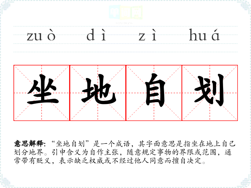 “坐地自划”是一个成语,其字面意思是指坐在地上自己划分地界。引申含义为自作主张,随意规定事物的界限或范围,通常带有贬义,表示缺乏权威或不经过他人同意而擅自决定。