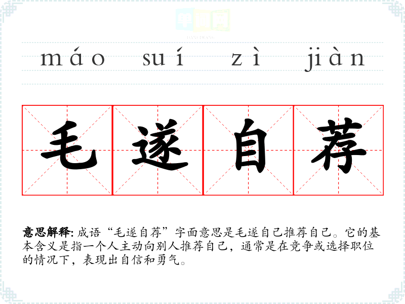 “毛遂自荐”让我联想到勇敢和自信的形象。它传达出一种积极向上的态度,激励我在面对机会时,勇于展示自己的能力而不退缩。