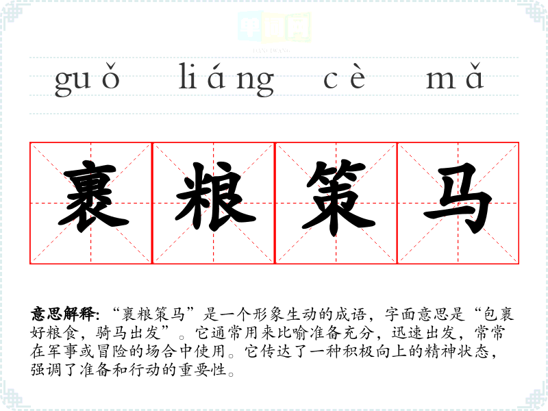该成语的具体来源并不明确,但可以追溯到古代的军事活动和游牧生活。在古代,战士在出征前需要准备充足的粮食和装备,以便在不确定的环境中生存和战斗。成语中的“裹粮”象征着充分的准备,而“策马”则代表快速的行动和出发。