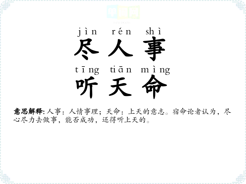 | 尽人事,听天命 | 人事:人情事理;天命:上天的意志。宿命论者认为,尽心尽力去做事,能否成功,还得听上天的。 |