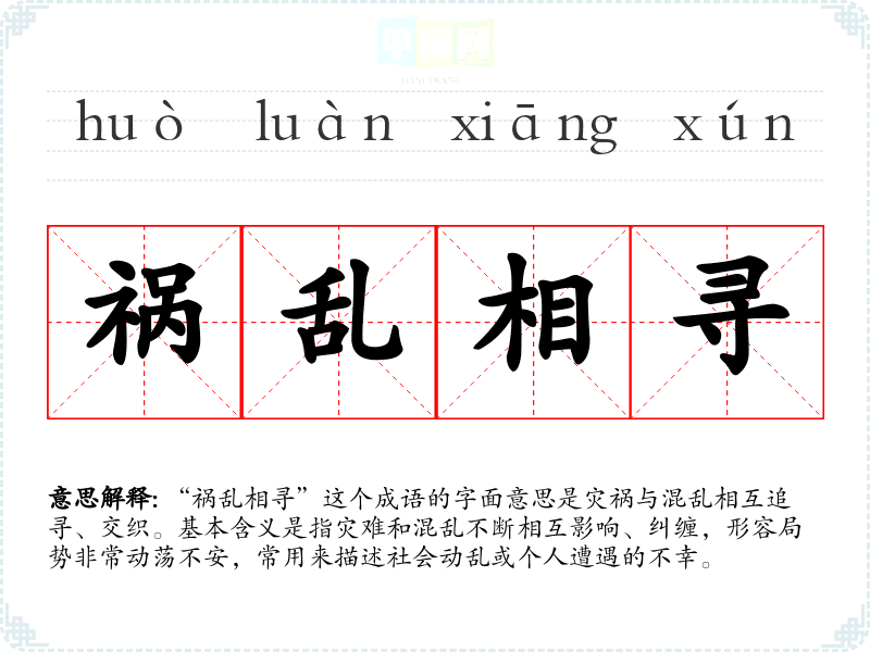 “祸乱相寻”并没有明确的历史典故或文学出处,但其字面构成来自于汉字的基本意义。可以理解为“祸”和“乱”都是不幸和混乱的象征,二者结合起来,形成了一种情境,表明在某种环境下,这种不幸和混乱是不断交织的。