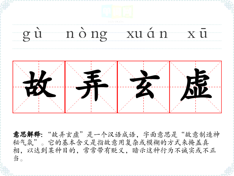 “故弄玄虚”是一个汉语成语,字面意思是“故意制造神秘气氛”。它的基本含义是指故意用复杂或模糊的方式来掩盖真相,以达到某种目的,常常带有贬义,暗示这种行为不诚实或不正当。