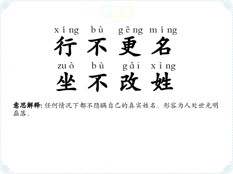 | 行不更名,坐不改姓 | 任何情况下都不隐瞒自己的真实姓名。形容为人处世光明磊落。 |