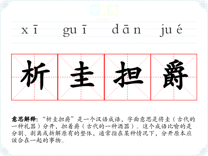 该成语的来源可以追溯到**古代的礼仪文化。圭是古代祭祀和礼仪中常用的物品,象征权利和地位,而爵则是用来盛酒的器具,通常用于饮酒和宴会场合。将圭分开,担着爵,寓意着对权力和地位的分割或削弱,反映出对传统礼仪的挑战或改变。
