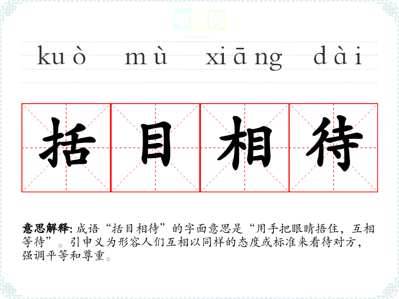 成语“括目相待”的字面意思是“用手把眼睛捂住,互相等待”。引申义为形容人们互相以同样的态度或标准来看待对方,强调平等和尊重。