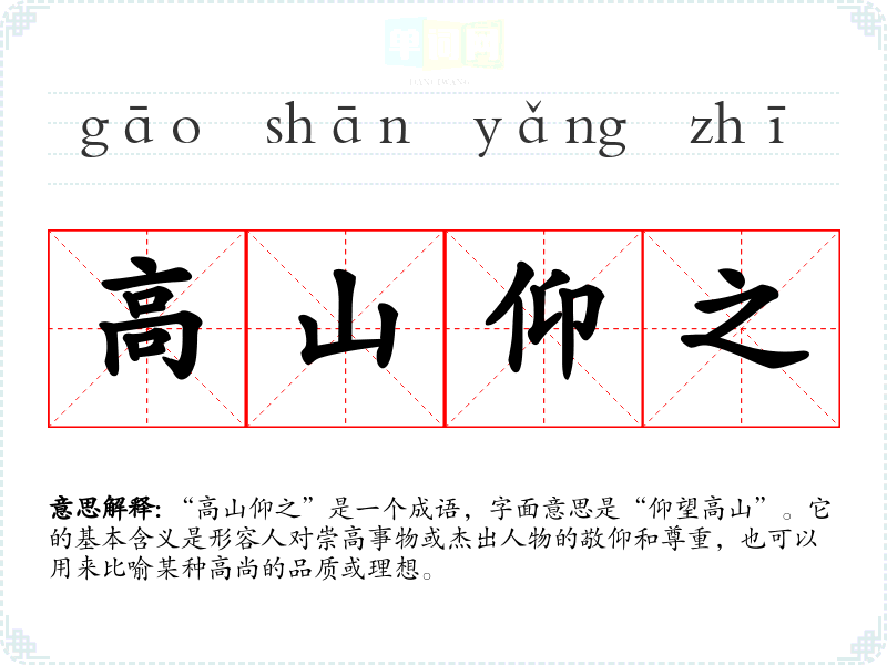“高山仰之”是一个成语,字面意思是“仰望高山”。它的基本含义是形容人对崇高事物或杰出人物的敬仰和尊重,也可以用来比喻某种高尚的品质或理想。