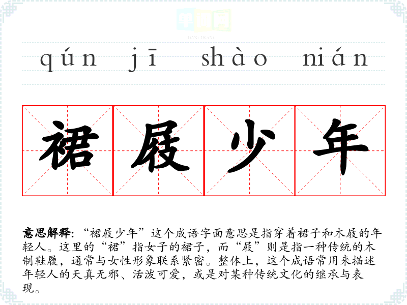 “裙屐少年”这个成语字面意思是指穿着裙子和木屐的年轻人。这里的“裙”指女子的裙子,而“屐”则是指一种传统的木制鞋履,通常与女性形象联系紧密。整体上,这个成语常用来描述年轻人的天真无邪、活泼可爱,或是对某种传统文化的继承与表现。