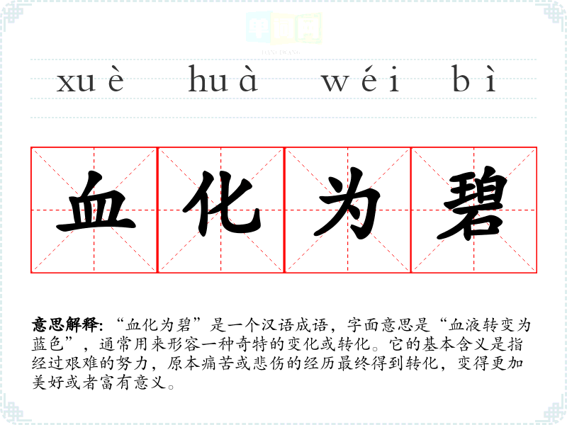 在**文化中,血液常常与牺牲、痛苦、奋斗相联系,而“碧”则代表着希望与美好。这个成语反映了人们对生命中艰难时刻的思考,强调了从痛苦中提炼出积极意义的重要性。在现代社会,这种思想依然适用,尤其是在面对压力和挑战时,人们努力寻找转变与成长的机会。