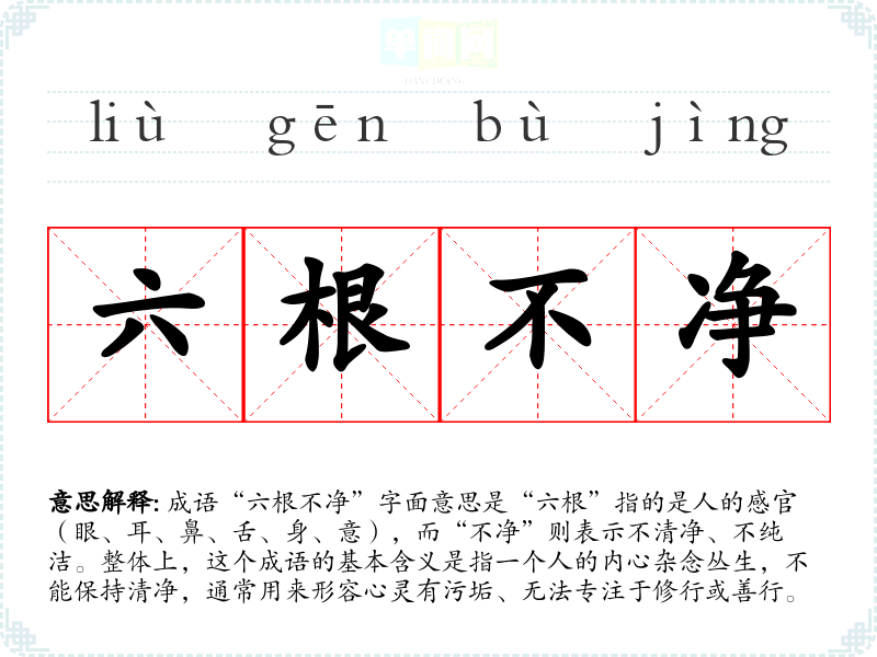 成语“六根不净”字面意思是“六根”指的是人的感官(眼、耳、鼻、舌、身、意),而“不净”则表示不清净、不纯洁。整体上,这个成语的基本含义是指一个人的内心杂念丛生,不能保持清净,通常用来形容心灵有污垢、无法专注于修行或善行。