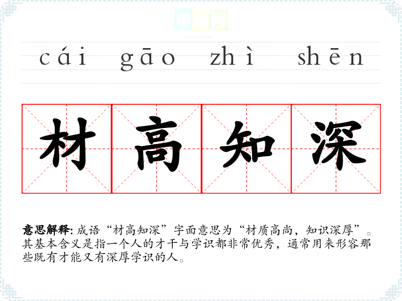 成语“材高知深”字面意思为“材质高尚,知识深厚”。其基本含义是指一个人的才干与学识都非常优秀,通常用来形容那些既有才能又有深厚学识的人。