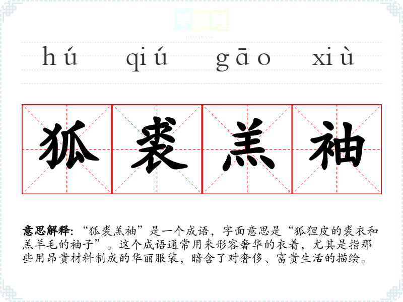 “狐裘羔袖”是一个成语,字面意思是“狐狸皮的裘衣和羔羊毛的袖子”。这个成语通常用来形容奢华的衣着,尤其是指那些用昂贵材料制成的华丽服装,暗含了对奢侈、富贵生活的描绘。