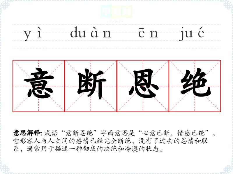 成语“意断恩绝”字面意思是“心意已断,情感已绝”。它形容人与人之间的感情已经完全断绝,没有了过去的恩情和联系,通常用于描述一种彻底的决绝和冷漠的状态。