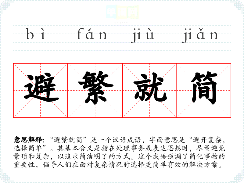 “避繁就简”是一个汉语成语,字面意思是“避开复杂,选择简单”。其基本含义是指在处理事务或表达思想时,尽量避免繁琐和复杂,以追求简洁明了的方式。这个成语强调了简化事物的重要性,倡导人们在面对复杂情况时选择更简单有效的解决方案。