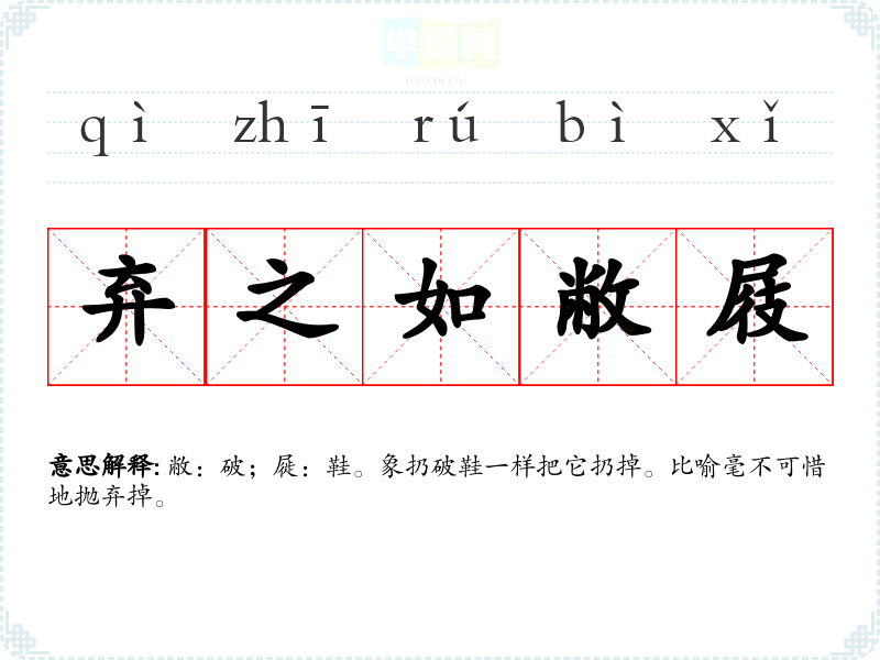 | 弃如敝屣 | 敝:破烂的。屣:鞋。像扔破鞋一样扔掉。比喻毫不可惜地扔掉或抛弃。亦作“弃若敝屣”、“去如敝屣”、“如弃敝屣”。 |