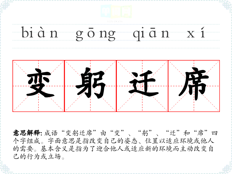 成语“变躬迁席”由“变”、“躬”、“迁”和“席”四个字组成。字面意思是指改变自己的姿态、位置以适应环境或他人的需要。基本含义是指为了迎合他人或适应新的环境而主动改变自己的行为或立场。