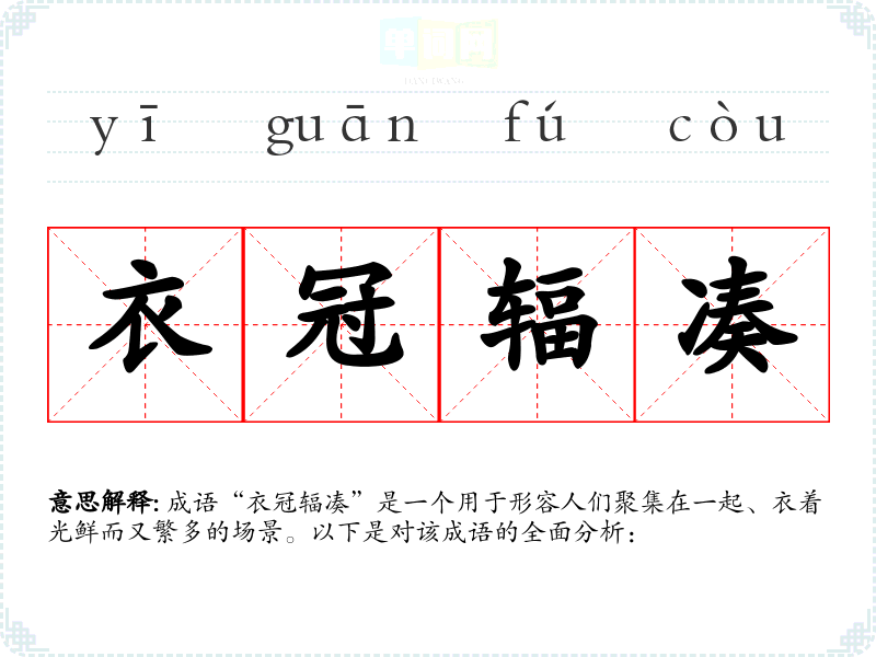 成语“衣冠辐凑”是一个用于形容人们聚集在一起、衣着光鲜而又繁多的场景。以下是对该成语的全面分析:
