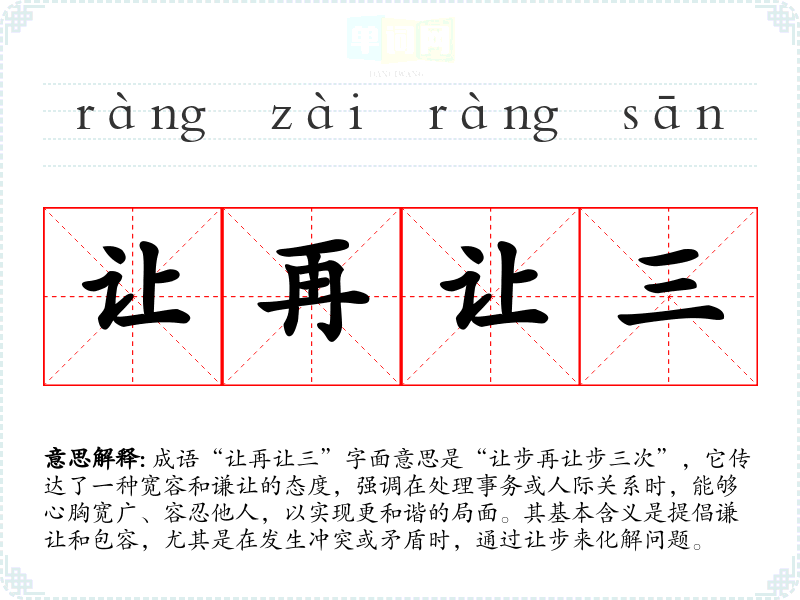 成语“让再让三”字面意思是“让步再让步三次”,它传达了一种宽容和谦让的态度,强调在处理事务或人际关系时,能够心胸宽广、容忍他人,以实现更和谐的局面。其基本含义是提倡谦让和包容,尤其是在发生冲突或矛盾时,通过让步来化解问题。