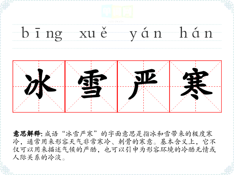 成语“冰雪严寒”的字面意思是指冰和雪带来的极度寒冷,通常用来形容天气非常寒冷、刺骨的寒意。基本含义上,它不仅可以用来描述气候的严酷,也可以引申为形容环境的冷酷无情或人际关系的冷淡。