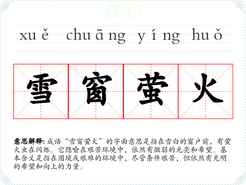 成语“雪窗萤火”的字面意思是指在雪白的窗户前,有萤火虫在闪烁。它隐喻在艰苦环境中,依然有微弱的光亮和希望。基本含义是指在困境或艰难的环境中,尽管条件艰苦,但依然有光明的希望和向上的力量。