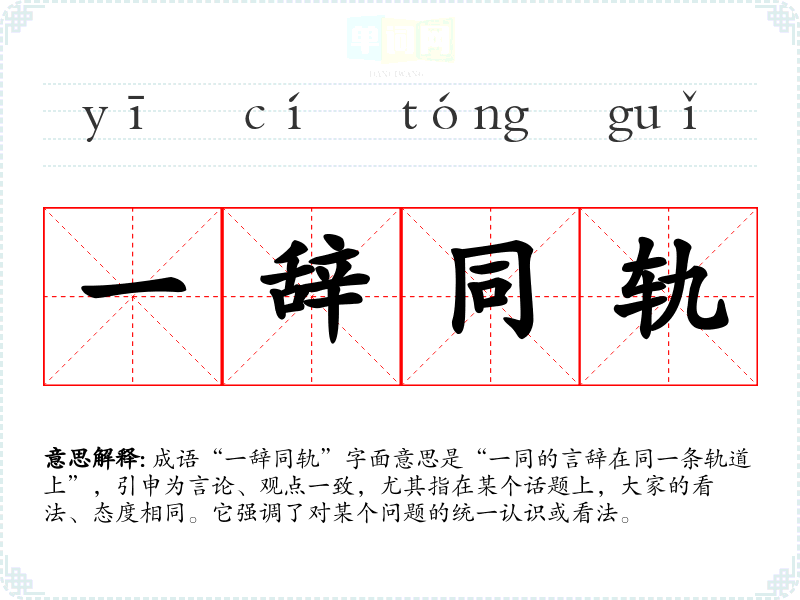 成语“一辞同轨”字面意思是“一同的言辞在同一条轨道上”,引申为言论、观点一致,尤其指在某个话题上,大家的看法、态度相同。它强调了对某个问题的统一认识或看法。