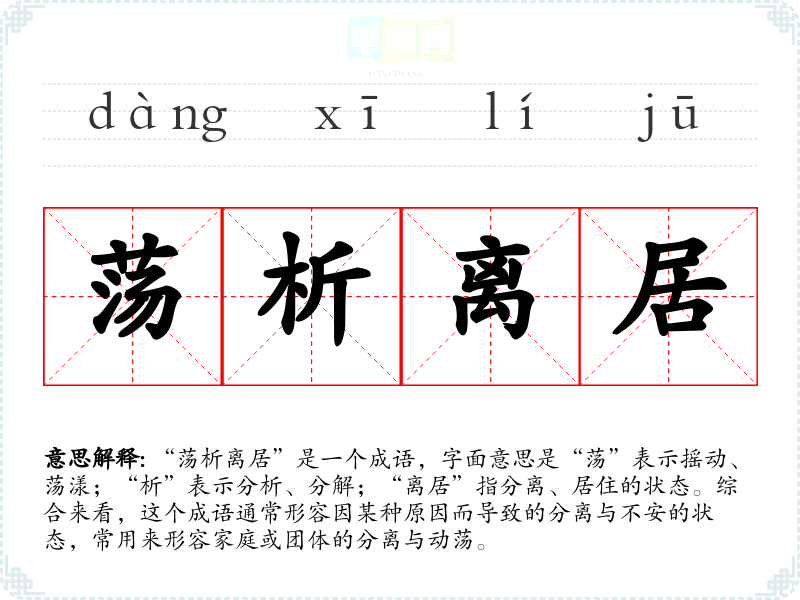“荡析离居”是一个成语,字面意思是“荡”表示摇动、荡漾;“析”表示分析、分解;“离居”指分离、居住的状态。综合来看,这个成语通常形容因某种原因而导致的分离与不安的状态,常用来形容家庭或团体的分离与动荡。