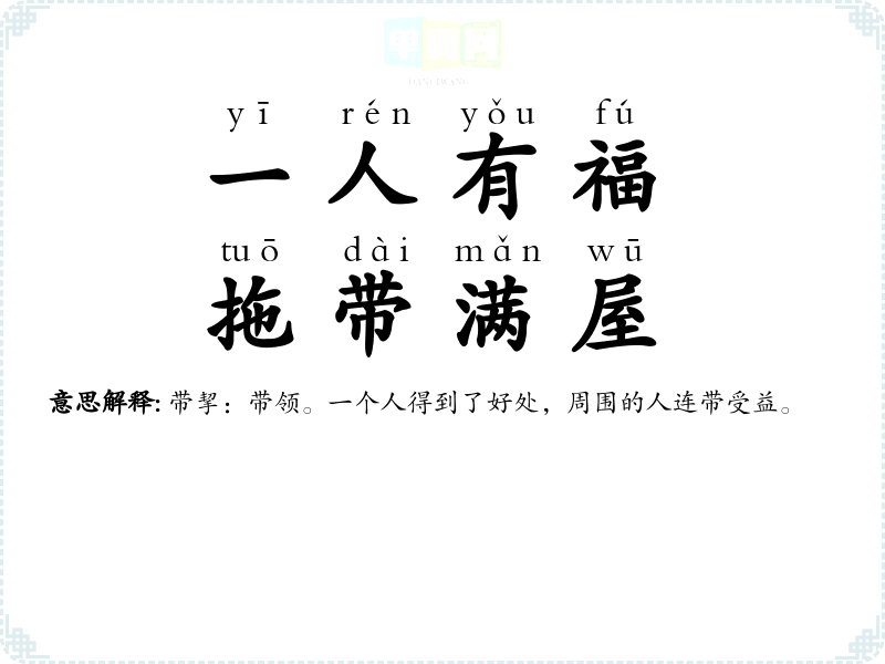 | 一人有福,带挈一屋 | 带挈:带领。一个人得到了好处,周围的人连带受益。 |