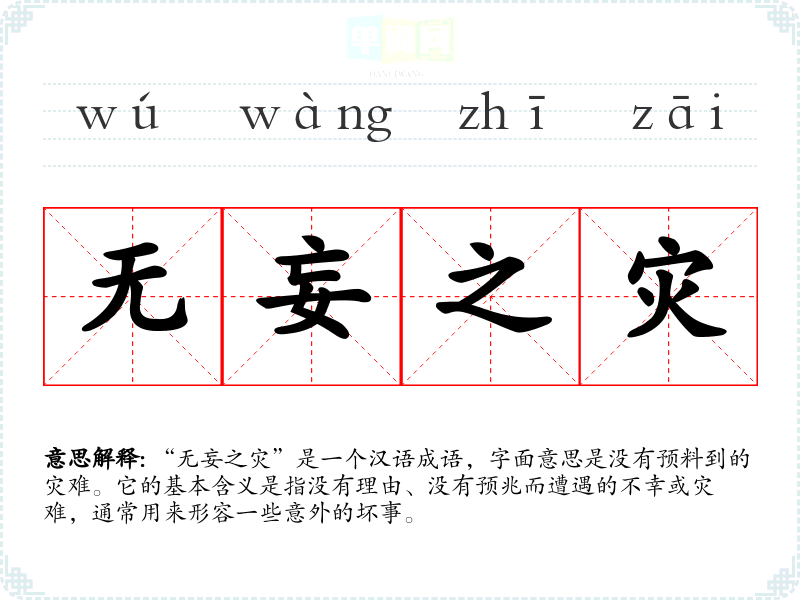 “无妄之灾”是一个汉语成语,字面意思是没有预料到的灾难。它的基本含义是指没有理由、没有预兆而遭遇的不幸或灾难,通常用来形容一些意外的坏事。