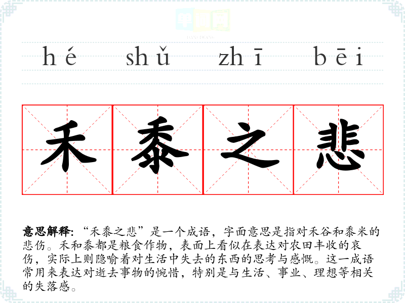 “禾黍之悲”是一个成语,字面意思是指对禾谷和黍米的悲伤。禾和黍都是粮食作物,表面上看似在表达对农田丰收的哀伤,实际上则隐喻着对生活中失去的东西的思考与感慨。这一成语常用来表达对逝去事物的惋惜,特别是与生活、事业、理想等相关的失落感。