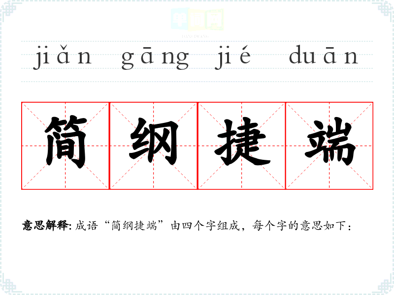 成语“简纲捷端”由四个字组成,每个字的意思如下: