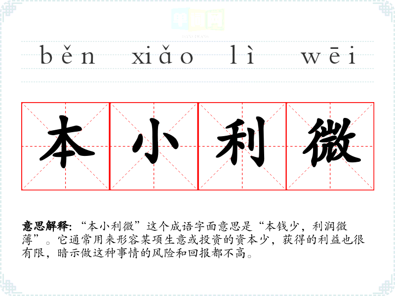 “本小利微”这个成语字面意思是“本钱少,利润微*”。它通常用来形容某项生意或投资的资本少,获得的利益也很有限,暗示做这种事情的风险和回报都不高。