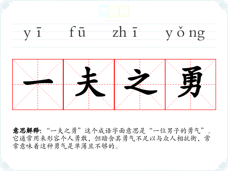 “一夫之勇”这个成语字面意思是“一位男子的勇气”。它通常用来形容个人勇敢,但暗含其勇气不足以与众人相抗衡,常常意味着这种勇气是单*且不够的。