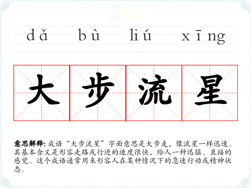 成语“大步流星”字面意思是大步走,像流星一样迅速。其基本含义是形容走路或行进的速度很快,给人一种迅猛、直接的感觉。这个成语通常用来形容人在某种情况下的急速行动或精神状态。
