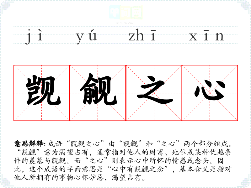 成语“觊觎之心”由“觊觎”和“之心”两个部分组成。“觊觎”意为渴望占有,通常指对他人的财富、地位或某种优越条件的羡慕与觊觎。而“之心”则表示心中所怀的情感或念头。因此,这个成语的字面意思是“心中有觊觎之念”,基本含义是指对他人所拥有的事物心怀妒忌,渴望占有。