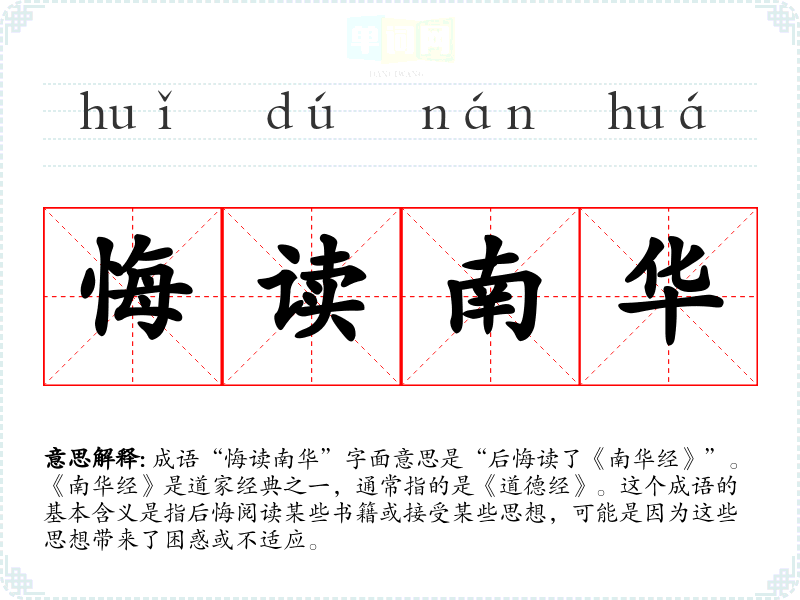 成语“悔读南华”字面意思是“后悔读了《南华经》”。《南华经》是道家经典之一,通常指的是《道德经》。这个成语的基本含义是指后悔阅读某些书籍或接受某些思想,可能是因为这些思想带来了困惑或不适应。