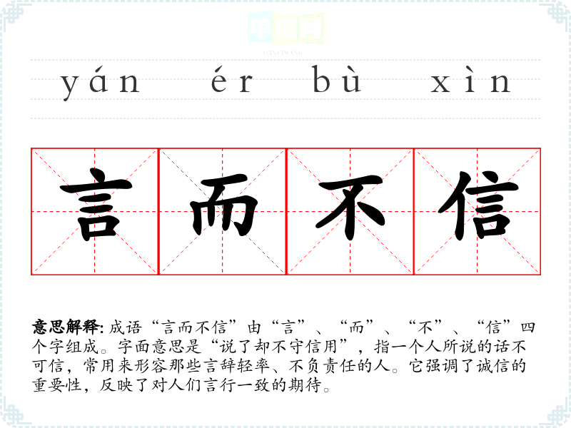 成语“言而不信”由“言”、“而”、“不”、“信”四个字组成。字面意思是“说了却不守信用”,指一个人所说的话不可信,常用来形容那些言辞轻率、不负责任的人。它强调了诚信的重要性,反映了对人们言行一致的期待。