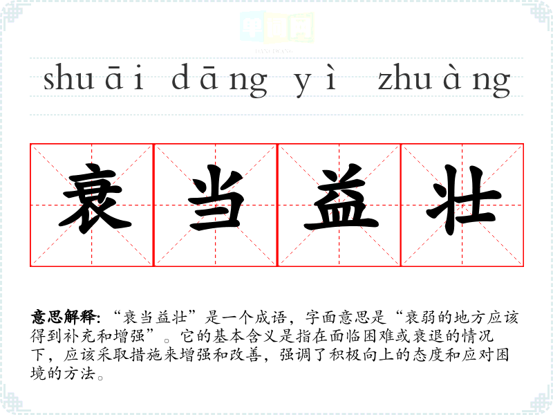 “衰当益壮”是一个成语,字面意思是“衰弱的地方应该得到补充和增强”。它的基本含义是指在面临困难或衰退的情况下,应该采取措施来增强和改善,强调了积极向上的态度和应对困境的方法。