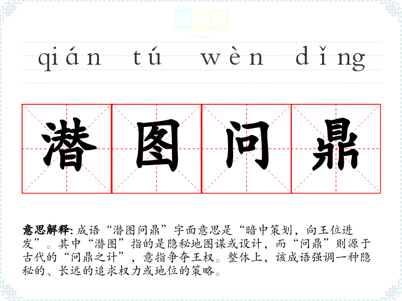 成语“潜图问鼎”字面意思是“暗中策划,向王位进发”。其中“潜图”指的是隐秘地图谋或设计,而“问鼎”则源于古代的“问鼎之计”,意指争夺王权。整体上,该成语强调一种隐秘的、长远的追求权力或地位的策略。