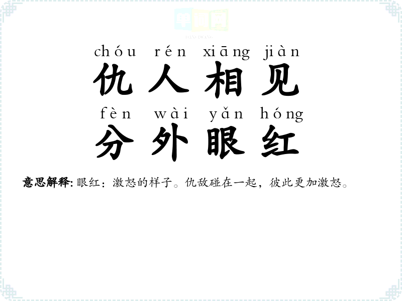 | 仇人见面,分外眼红 | 眼红:激怒的样子。仇敌碰在一起,彼此更加激怒。 |